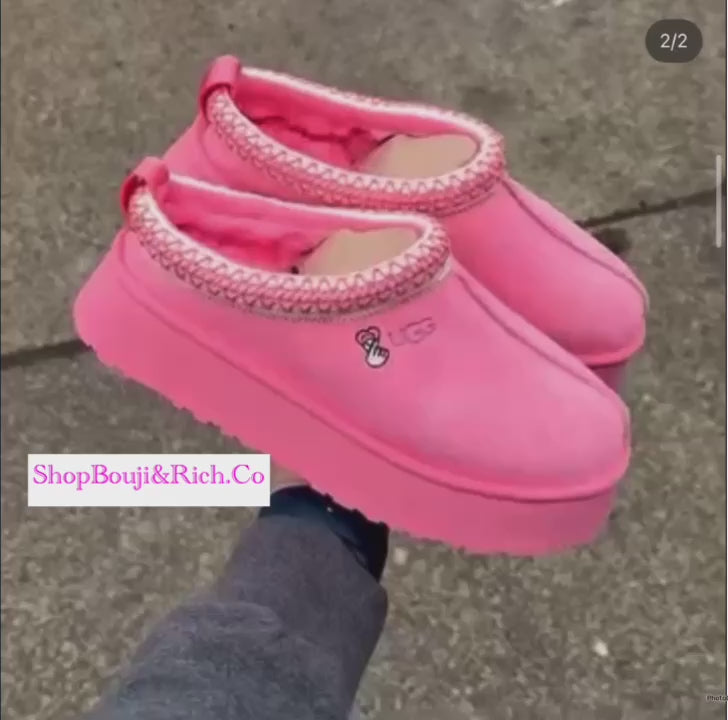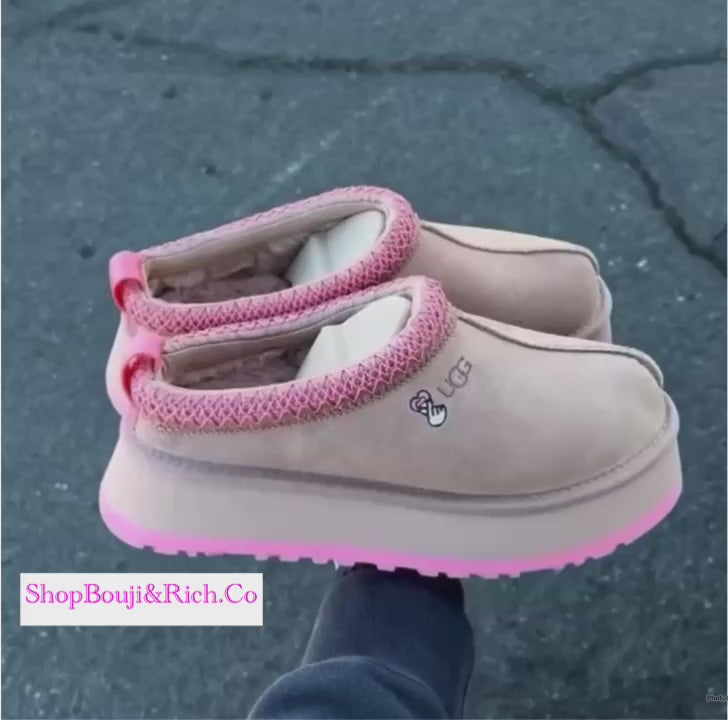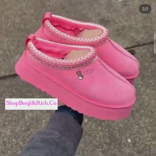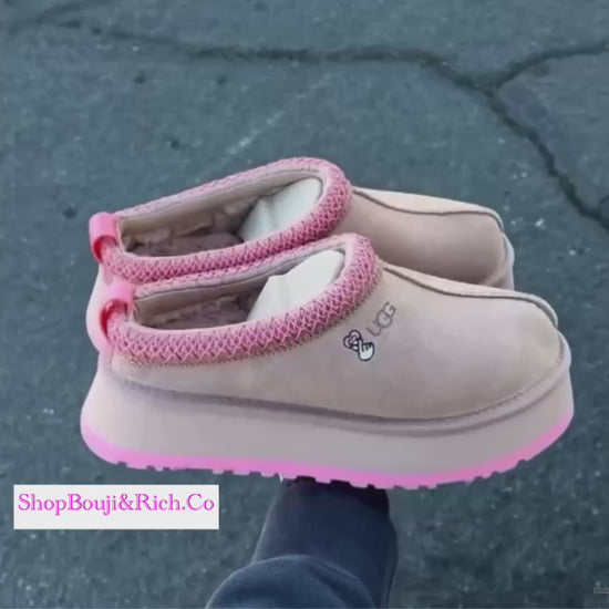 These UGG platform slippers feature a soft suede upper, plush faux-fur lining, and a cushioned platform sole for all-day wear. Designed for warmth and style, they’re perfect for lounging at home or stepping out in effortless comfort. The easy slip-on design makes them a go-to essential for cozy, chic days.